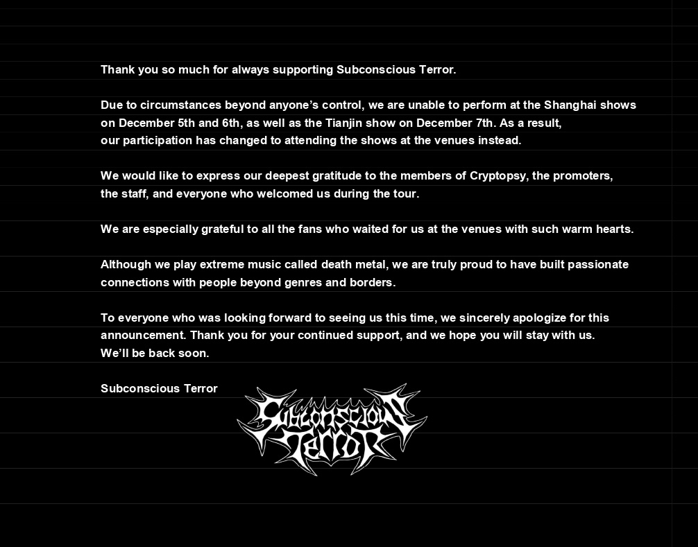 We sincerely thank everyone for your incredible support.Looking back, 80% of our shows this year were international, and we are proud to have shared so many unforgettable experiences across the globe.We are currently working on our next album, and we will keep pushing forward in 2026.Wishing everyone health, happiness, and continued success.Thank you!-Subconscious Terror-